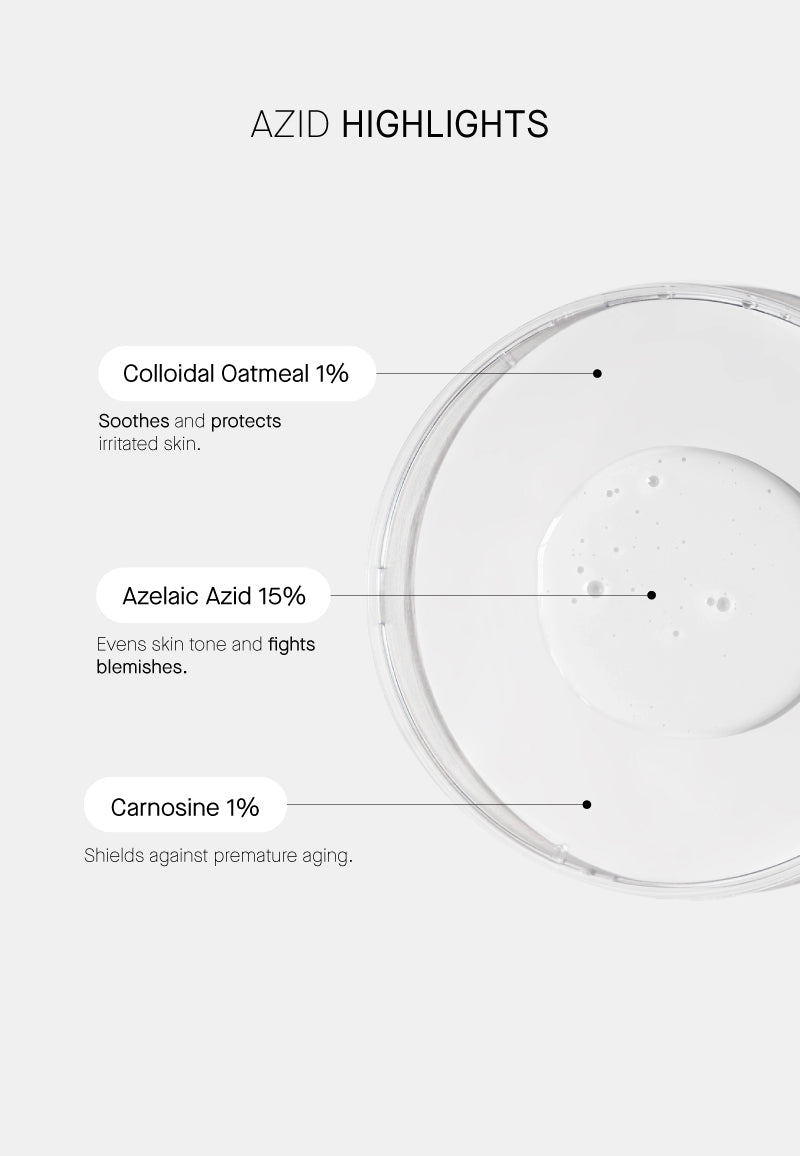 Azelaic Acid (۱۵٪)، Glycerin، Ceramides، Oat Kernel Flour، Peptides & Antioxidants |